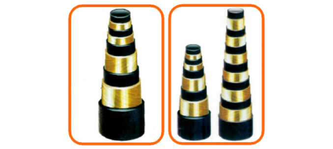 主要有內(nèi)膠層、中膠層、2、4、6層鋼絲纏繞層、外膠層組成。內(nèi)膠層具有輸送介質(zhì)、承受壓力,保護(hù)鋼絲不受侵蝕的作用,外膠層保護(hù)鋼絲不受損傷,鋼絲層是骨架材料,起增強作用。